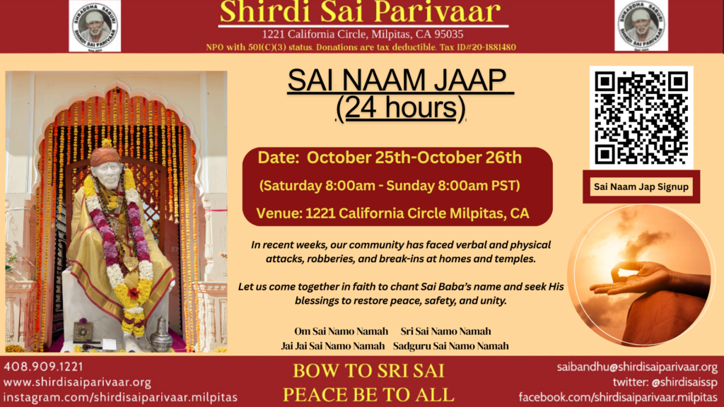 With love and humility, Shirdi Sai Parivaar invites you to participate in a 24-hour Sai Naam Japam starting at 8:00 AM on October 25th and concluding at 8:00 AM on October 26th, dedicated to the peace, safety, and well-being of our community and society.