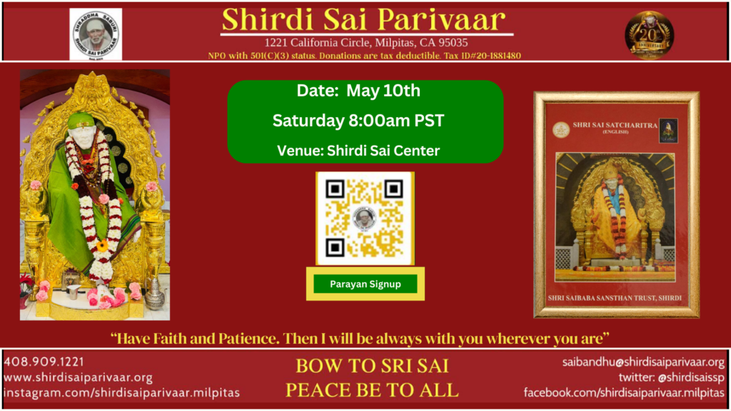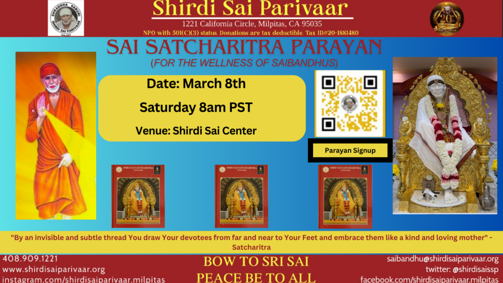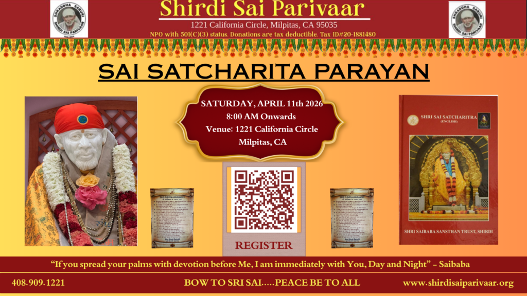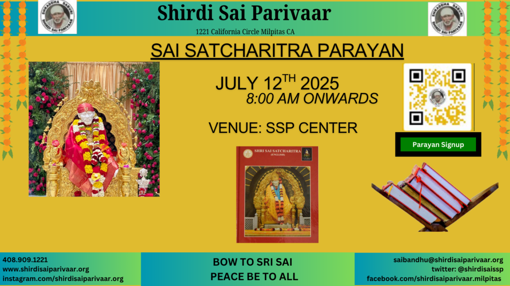 Sri Sai Satcharitra Parayan will be conducted in person at SSC, Milpitas, CA. Sai Satcharita Parayan will begin at 8:00 AM, and with Baba’s blessings we will conclude before Shej Arati.
