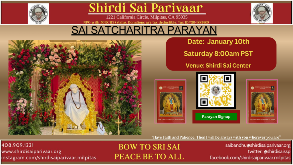 Sri Sai Satcharitra Parayan will be conducted in person at SSC, Milpitas, CA. Sai Satcharita Parayan will begin at 8:00 AM, and with Baba’s blessings we will conclude before Shej Arati.