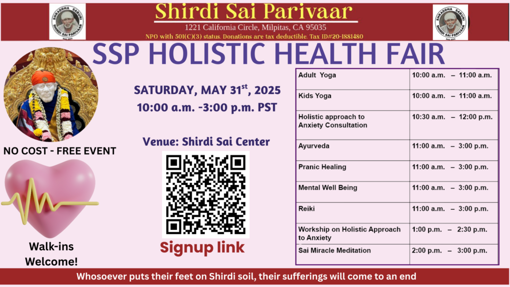 With Baba’s grace Shirdi Sai Parivaar will be hosting a Holistc Health Fair on “Holistic Health & Wellness” on Saturday, May 31st, from 10:30 AM to 3:00 PM . The activities planned are Ayurveda, Adult Yoga, Reiki, Mental Well Being, Sai Miracle Meditation,Holistic Approach to Anxiety Consultation, Workship on Holistic Approach for Anxiety.