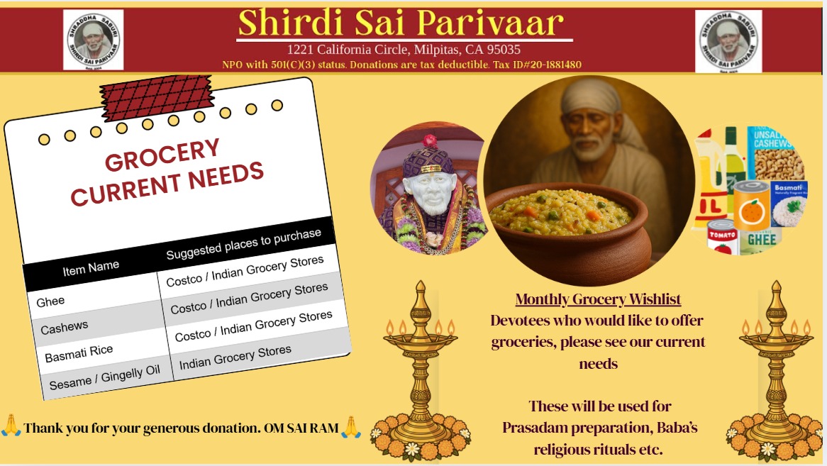 Devotees are welcome to bring anything as prasadam to Baba. Below are some suggestions.